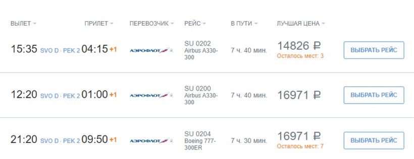 | Аэрофлот (SU 204) Boeing 777-300ER | 21:05 Москва (SVO) | 7 ч. 45 мин | 09:50 Пекин (PKX) | 27, 29, 31 октября, 2, 3, 5, 7, 9, 10, 12, 14, 16, 17, 19, 21, 23, 24, 26, 28, 30 ноября, … |