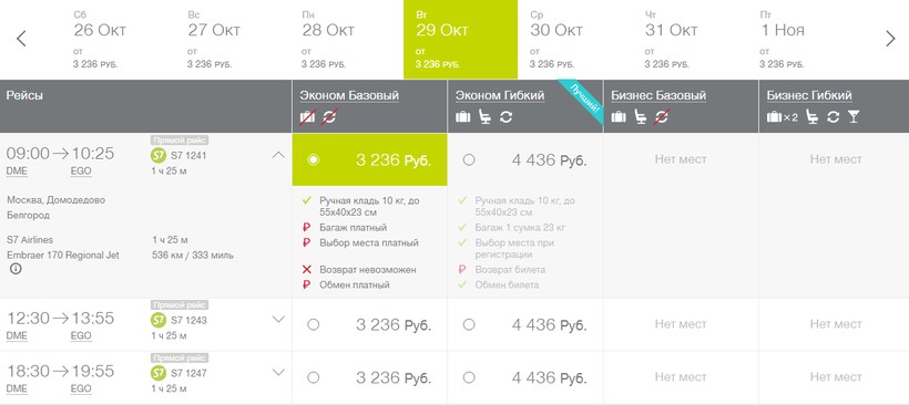 S7 Airlines (S7 1243) Embraer 170 | 12:10 Москва (DME) | 1 ч. 35 мин | 13:45 Белгород (EGO) | ежедневно с 30.10 |