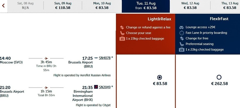 «Аэрофлот» и Brussels Airlines совершают совместные перелеты во все дни недели, кроме субботы. Со стыковкой в Брюсселе в 2–4 часа путешествие займет 7–9 ч. Дешевые билеты авиакомпании предлагают только с ручной кладью: в одну сторону будут стоить в среднем 6800–8800 ₽ (85–110 €), туда-обратно — от 14500 ₽ (180 €). С багажом полет дорогой — от 21500 ₽ (265 €) и 54500 ₽ (680 €) соответственно.