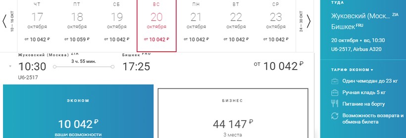 Ну а тем, кто любит летать в максимально комфортных условиях, рекомендую выбрать «Аэрофлот», потому что стоимость путешествия в бизнес-классе у него ниже, чем у Ural Airlines (напомню, киргизская компания «бизнес» не предлагает).