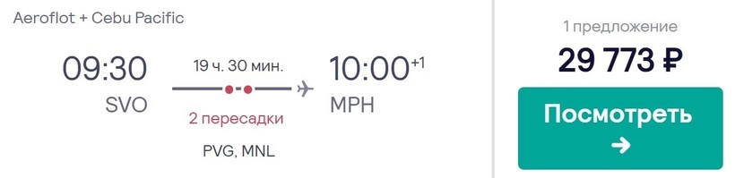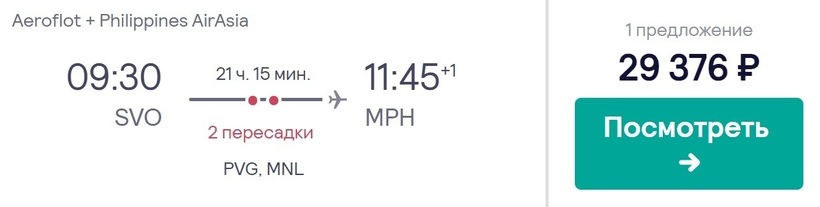 Заплатив почти на 1,5 тысячи (если также купить авиабилет за 1,5 месяца) дороже, с этими же авиакомпаниями можно добраться до конечного пункта за 19,5 часов. Стыковки также в Шанхае и Маниле. Только в этом случае они продлятся 2,5 и 3,5 часа соответственно.