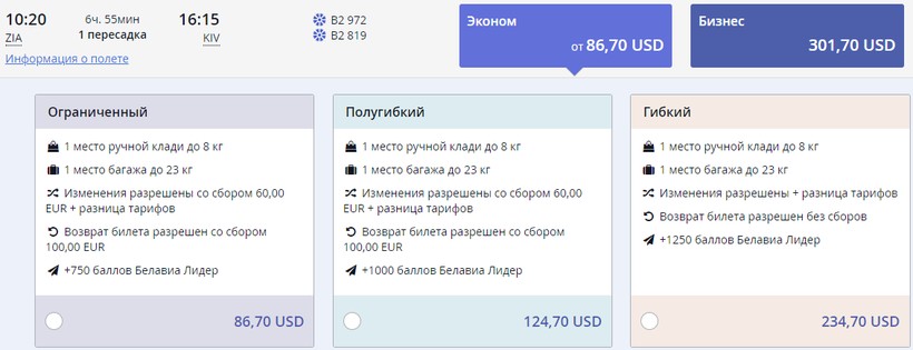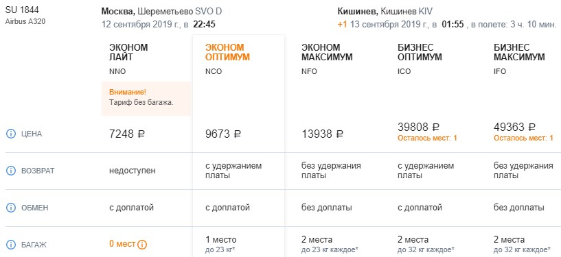Air Moldova. Для преодоления маршрута я скорее отдам предпочтение этому перевозчику, чем «Аэрофлоту», во-первых, потому, что расписание полетов у него удобнее — рейсы выполняются ежедневно по четыре раза в день в разное время суток. А во-вторых, стоимость авиапутешествия с Air Moldova дешевле. Смотрите сами: билет с багажом до 23 кг только туда можно купить за 8100 ₽, туда-обратно — от 16500 ₽. Перелет в бизнес-классе — от 23000 ₽. Обратите внимание, что у авиакомпании нет выгоды в покупке билетов сразу в обе стороны.