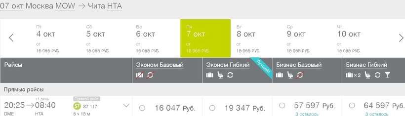 | S7 Airlines (S7 3049) Airbus A320 NEO | 00:50 Москва (DME) | 6 ч. 10 мин | 13:00 Чита (HTA) | 18, 23, 25 октября |