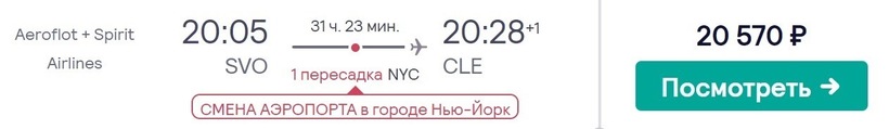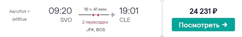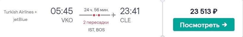 Также можно долететь сначала до Стамбула с Turkish Airlines, затем с этим же авиаоператором совершить полет в Бостон, а заключительный рейс в Кливленд осуществить с jetBlue (американский лоукостер). На стыковки в общей сложности уйдет 9,5 ч., а дорога до места назначения займет сутки. Авиаперелет по данному маршруту доступен ежедневно. Стоимость билетов только туда — от 23500 рублей (за месяц и более).