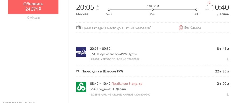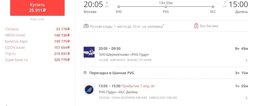 Портовый китайский город Далянь и столицу России прямое авиасообщение не связывает. Попасть сюда можно только транзитом. Один из стыковочных авиарейсов предлагает Japan Airlines. Японский авиаперевозчик доставит до места назначения за 14 часов. При этом стыковка будет одна — в Токио. На нее отводится 1,5 часа. Минус этого транзитного рейса заключается в стоимости билетов — она высокая. От 79000 рублей (за пару недель). Обратный перелет с этой же авиакомпанией обойдется примерно в такую же сумму. Дешевле до конечного пункта доберетесь с «Аэрофлотом» и China Southern. Билеты только туда за пару недель стоят от 26000 рублей. Общее время в пути — 14 ч. Перевозчики доставляют через Шанхай. Первый рейс выполняет российская а/к, его продолжительность 8,5 ч. У «Аэрофлота» советую брать «Эконом Бюджет». Это самый дешевый тариф. Включенные опции: