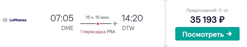 Прямые самолеты из столицы РФ в Детройт не летают. Один из самых быстрых перелетов с одной стыковкой (в аэропорту Франкфурта-на-Майне) предлагает флагманский авиаперевозчик Германии — Lufthansa. Общее время в пути — 15 часов. На пересадку дается 2 часа. Билеты за месяц — от 35200 рублей. Обратные проездные обойдутся примерно в такую же сумму. У а/к есть как экономкласс, так и бизнес.