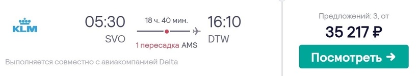 За такие же деньги (при условии, что купите билеты не менее, чем за месяц) до Детройта можно добраться с пересадкой в Амстердаме (воздушная гавань Схипхол). Перевозчики — нидерландская а/к KLM и американская Delta. В дороге проведете 18,5 ч. Пересадка длится 6 ч.