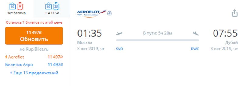 | Аэрофлот (SU 526) Boeing 737-800 | 11:15 Москва (SVO) | 5 ч. 45 мин | 18:00 Дубай (DXB) | 26, 28, 29, 30, 31 октября, 10, 11, 12, 13, 14, 15, 16, 17, 18, 19, 20, 21, 22, 23, 24 ноября, … |