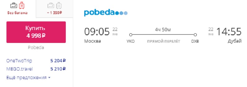 | Победа (DP 991) Boeing 737-800 | 07:20 Москва (VKO) | 5 ч. 25 мин | 13:45 Дубай (DWC) | 20 октября |