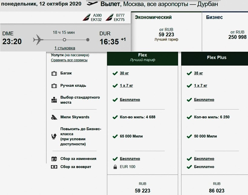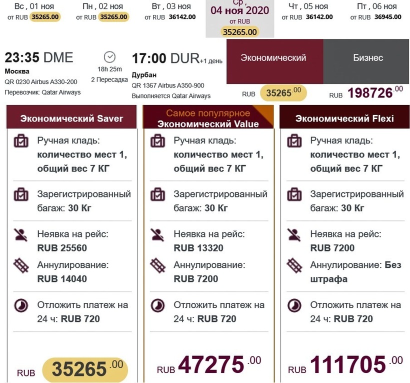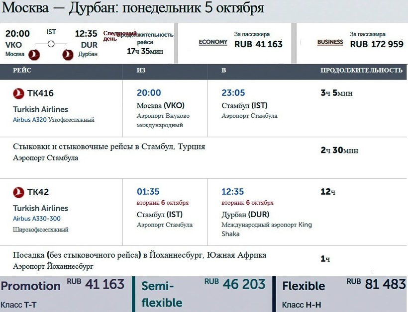 Билеты «туда-обратно» в ноябре обойдутся вам всего в 66 239 рублей, а в октябре придется заплатить за них не менее 88 973 рубля. В среднем же, долететь до Дурбана и вернуться в Москву можно за 78 090 рублей.