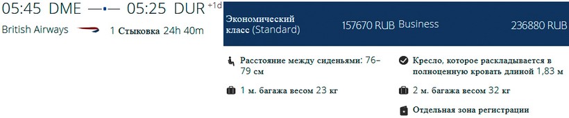British Airways уступает предыдущему авиаоператору по расписанию полетов — британская компания выполняет авиарейсы только по понедельникам, четвергам и субботам. Путешествие получается продолжительным — с девятичасовой пересадкой в Лондоне занимает 25 часов. К недостаткам этого варианта авиаперелета отнесу необходимость оформления британской визы. Полет с British Airways в одну сторону рекомендую в исключительных случаях, потому что он очень дорогой — с багажом обойдется от 157500 ₽. Зато если оформить авиабилет и на обратную дорогу, это будет стоить всего от 93500 ₽. Бизнес-класс — от 237000 ₽.