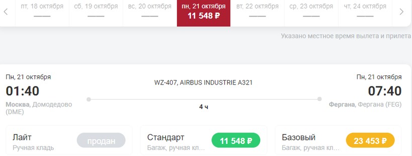 | Узбекистон Хаво Йуллари (HY 9628) Airbus A320 | 09:05 Москва (VKO) | 4 ч. 15 мин | 15:20 Фергана (FEG) | 21, 22, 23, 24, 25 октября |