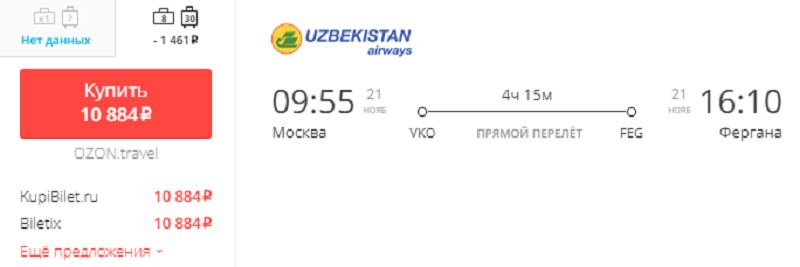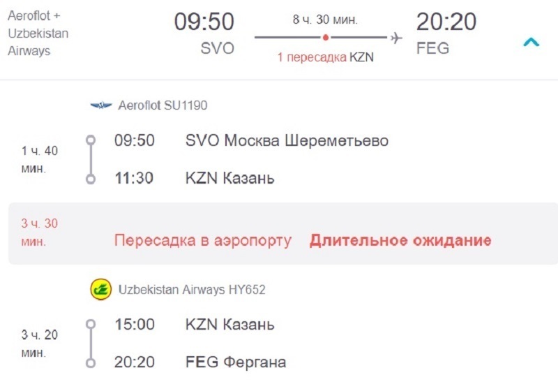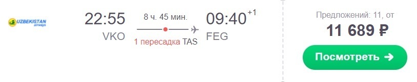 Если прямой самолет доставит вас в Фергану за 4 часа, то с пересадкой время в дороге увеличится минимум до 9 часов (билеты можно купить за 2 месяца до вылета за 11000–12000 рублей). Один из самых удобных вариантов полететь через Ташкент вместе с Uzbekistan Airways. Общее время в пути — 8 часов 45 минут. Время на пересадку в аэропорту — 4 часа. Билеты от 11700, если покупать за 2,5 месяца до отправления.