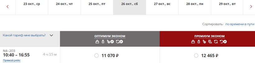 Nordwind Airlines. Авиабилеты за 1,5 месяца до вылета — от 11000 рублей. Перевозчик предлагает 2 тарифа в экономкласс — «Оптимум» и «Премиум». Условия первого тарифа: 1 место ручной клади (до 5 кг), багаж (1 место до 15 кг), питание включено в стоимость билета. Условия второго тарифа: 1 место ручной клади (до 5 кг), багаж (1 место до 20 кг), выбор питания по меню бесплатный (в «Оптимум» это можно также сделать, но за отдельную плату). Разница между тарифами незначительная, немногим более 1000 рублей.