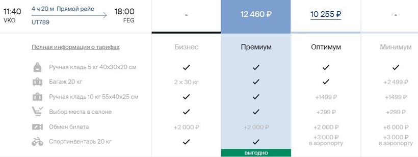 Utair. Билеты на самолет этой авиакомпании выгоднее покупать за 2 месяца до вылета, так их стоимость стартует с 10300 рублей. Есть 2 тарифа — «Оптимум» и «Премиум». Первый, он же самый дешевый, позволит вам взять ручную кладь (1 место до 5 кг), плюс сдать багаж (1 место до 20 кг). Выбор места в салоне — за дополнительную плату. Тариф «Премиум» даст возможность пронести в самолет 2 сумки ручной клади (вес первой — 5 кг, а второй — не более 10 кг).