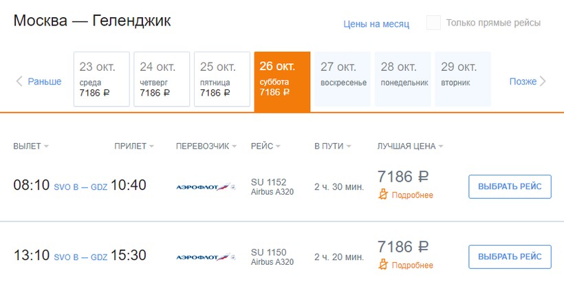Аэрофлот (SU 1154) Airbus A320 | 06:40 Москва (SVO) | 4 ч. 00 мин | 10:40 Геленджик (GDZ) | 9, 10 октября |