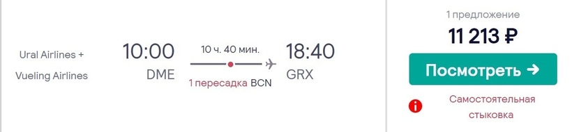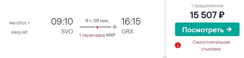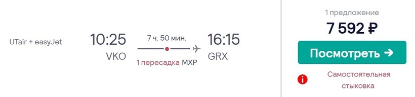 Испанский город Гранада и столицу РФ не связывает прямое авиасообщение, добраться туда можно только стыковочными рейсами. Российская а/к «Аэрофлот» и британский лоукостер easyJet смогут доставить до конечного пункта за 9 часов с пересадкой (3 ч.) в Милане (аэропорт Мальпенса). У авиакомпаний нет договоренностей о пересадке, так что в Милане нужно будет забрать и заново сдать багаж. Теперь о стоимости авиабилетов. За месяц до вылета их можно купить за 15500 рублей. Обратные обойдутся в такую же сумму.