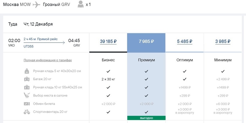 «Максимум». Если вы не уверены насчет точной даты поездки в Грозный, то выбирайте его. Билет можно вернуть без удержания платы. Норма провоза багажа: 2 места (до 23 кг). По ручной клади все неизменно.