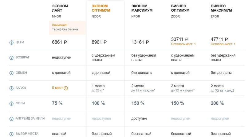 «Лайт». Авиабилет невозвратный, багажа нет, в самолет можно взять 1 сумку до 10 кг.