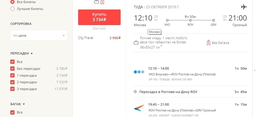 | Аэрофлот (SU 1496) Boeing 737-800 | 15:35 Москва (SVO) | 3 ч. 05 мин | 18:40 Грозный (GRV) | 22 октября |
