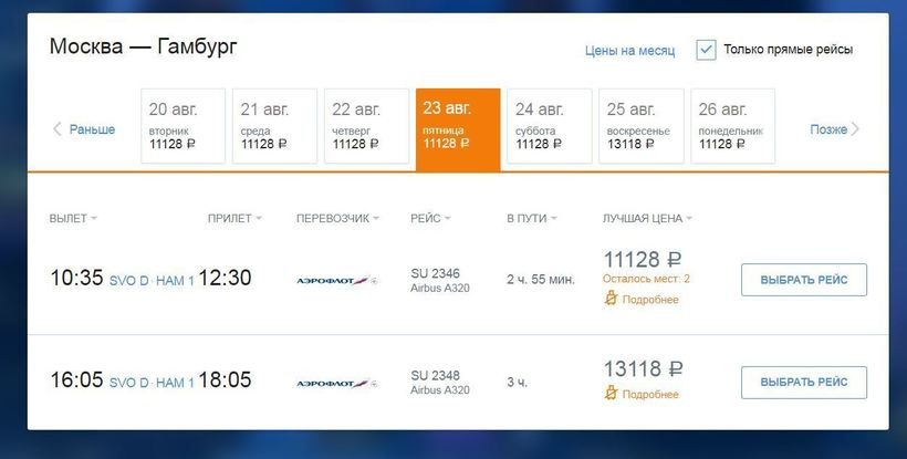 | Аэрофлот (SU 2346) Airbus A320 | 10:30 Москва (SVO) | 3 ч. 00 мин | 12:30 Гамбург (HAM) | вт, ср, чт с 03.05 по 29.09 |