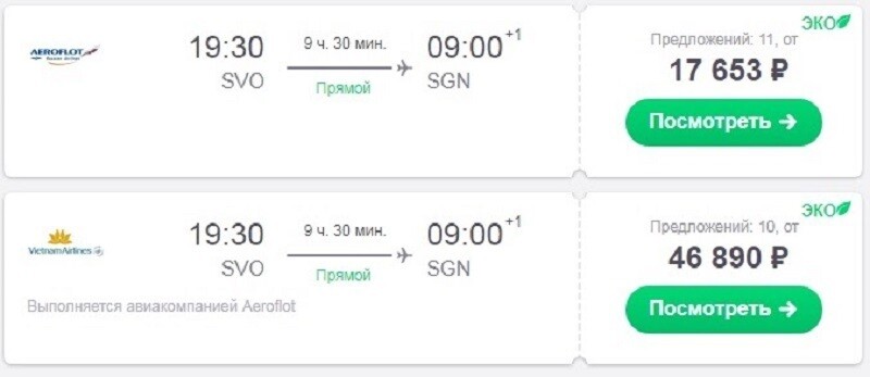 Прямые самолеты по маршруту летают только по средам и воскресеньям (отправление — вечером, расписание уже давно не менялось). Это так называемые код-шеринговые рейсы. Авиабилеты на них продает и наш «Аэрофлот», и вьетнамская авиакомпания Vietnam Airlines согласно заключенному код-шеринговому соглашению. Перелеты всегда выполняет «Аэрофлот», он и несет ответственность за пассажиров. Но если вы по какой-то причине захотите купить билет через Vietnam Airlines, то, пожалуйста. Может это будет выгодно, если вы, например, является участником программы лояльности этой компании. Хотя разница в цене колоссальная. Вот, например, если я захочу сейчас купить билет до Хошимина на середину сентября (тут осталось буквально полтора месяца), то у «Аэрофлота» самый дешевый будет стоить 17650 рублей, а у вьетнамского перевозчика цены стартуют с 46900 рублей. Разница очевидна.