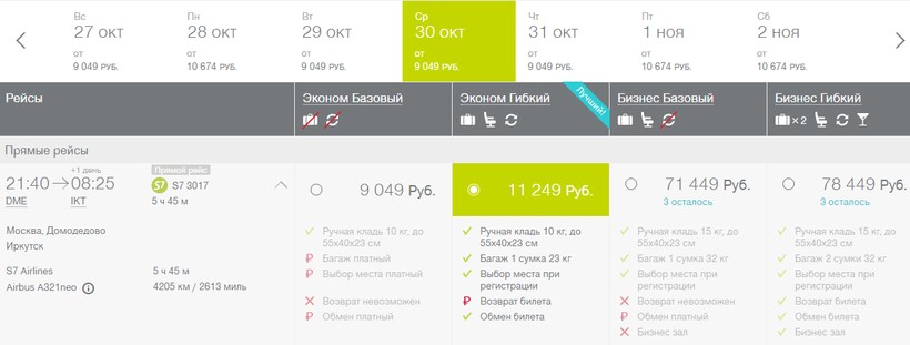 | S7 Airlines (S7 3021) Boeing 737-800 | 12:30 Москва (DME) | 5 ч. 55 мин | 23:25 Иркутск (IKT) | 27, 28, 29, 30, 31 октября, 3, 4, 5, 6, 7, 10, 11, 12, 13, 14, 17, 18, 19, 20, 21 ноября, … |