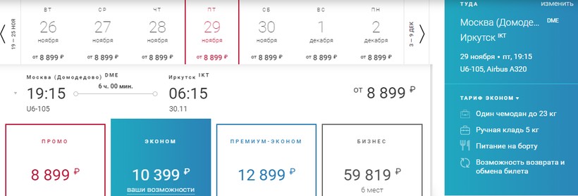 | Уральские авиалинии (U6 105) Airbus А320 | 19:30 Москва (DME) | 5 ч. 50 мин | 06:20 Иркутск (IKT) | 27, 30, 31 октября, 1, 2, 3, 6 ноября, 19, 21, 22, 24, 25, 26, 27, 28, 29, 30 декабря, 1, 2, 3 января, … |