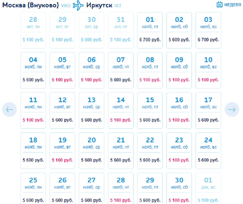 Билеты «туда-обратно» в октябре обойдутся вам всего в 14 415 рублей, а в сентябре придется заплатить за них не менее 26 712 рублей. В среднем же, долететь до Иркутска и вернуться в Москву можно за 20 855 рублей.