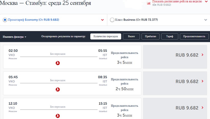 | Аэрофлот (SU 2136) Boeing 737-800 | 09:10 Москва (SVO) | 5 ч. 05 мин | 14:15 Стамбул (IST) | 25 октября |