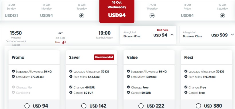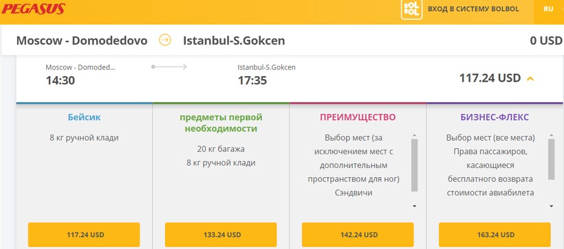 Atlasglobal. Расписание полетов у авиакомпании самое неудобное — полеты только по понедельникам, средам, пятницам и воскресеньям. А по ценовому сегменту Atlasglobal можно сравнивать с Pegasus Airlines — билеты в одну сторону с багажом стоят в среднем 6200–7700 ₽, туда-обратно — от 11500 ₽. Но в отличие от Pegasus, Atlasglobal предлагает путешествия в бизнес-классе — от 34000 ₽.