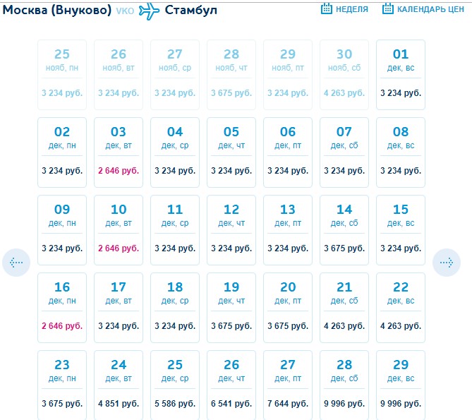 | Победа (DP 995) Boeing 737-800 | 07:00 Москва (VKO) | 5 ч. 10 мин | 12:10 Стамбул (IST) | 11 ноября |
