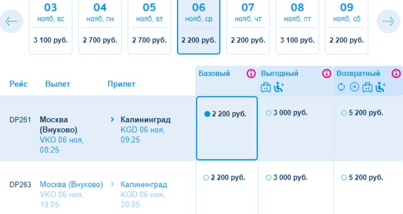 | Россия (FV 6309) Сухой Суперджет 100 | 10:55 Москва (SVO) | 2 ч. 45 мин | 12:40 Калининград (KGD) | 2, 3, 4 ноября |