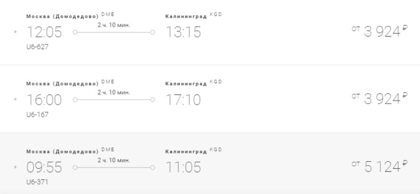Неплохие варианты по соотношению цены и комфорта предлагает Ural Airlines. Он отправляется в Калининград 2–3 раза в день.