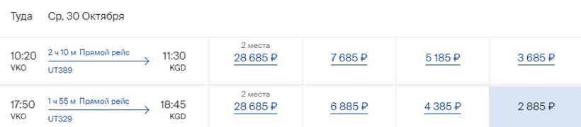 | Россия (FV 6151) Сухой Суперджет 100 | 12:00 Москва (SVO) | 2 ч. 40 мин | 13:40 Калининград (KGD) | 31 октября, 1 ноября |