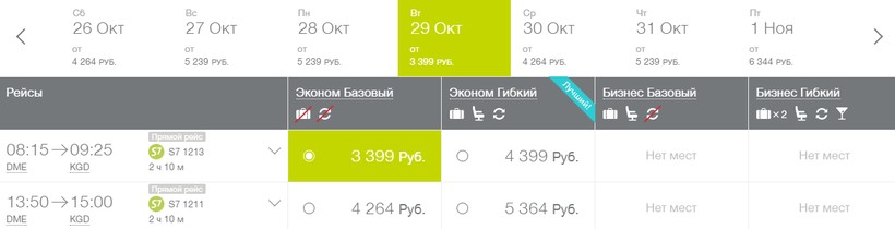 | S7 Airlines (S7 1213) Airbus А320 | 10:50 Москва (DME) | 2 ч. 50 мин | 12:40 Калининград (KGD) | ежедневно, кроме вт, вс по 25.10 |