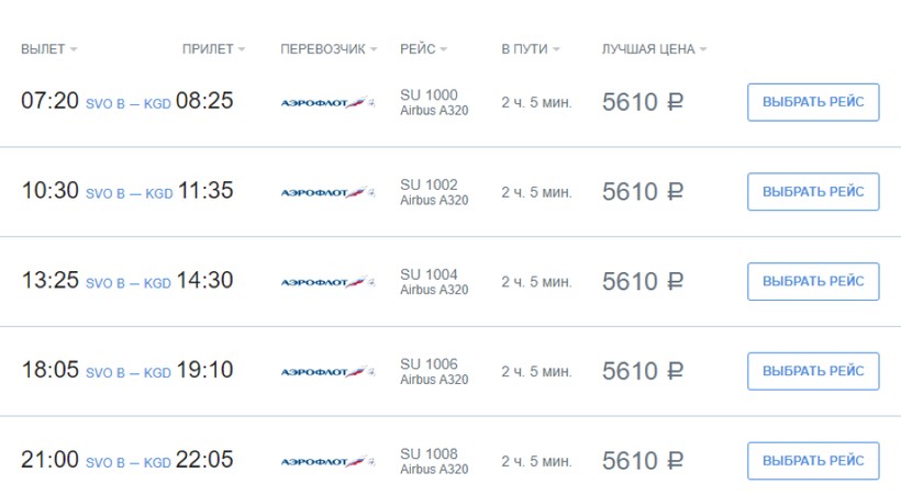| Аэрофлот (SU 1014) Airbus A320 | 08:05 Москва (SVO) | 2 ч. 40 мин | 09:45 Калининград (KGD) | 7 января |