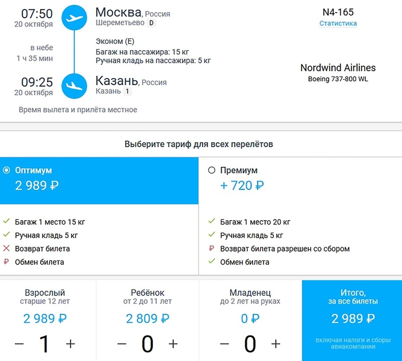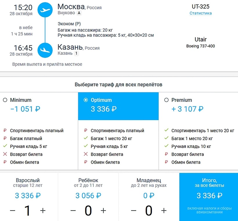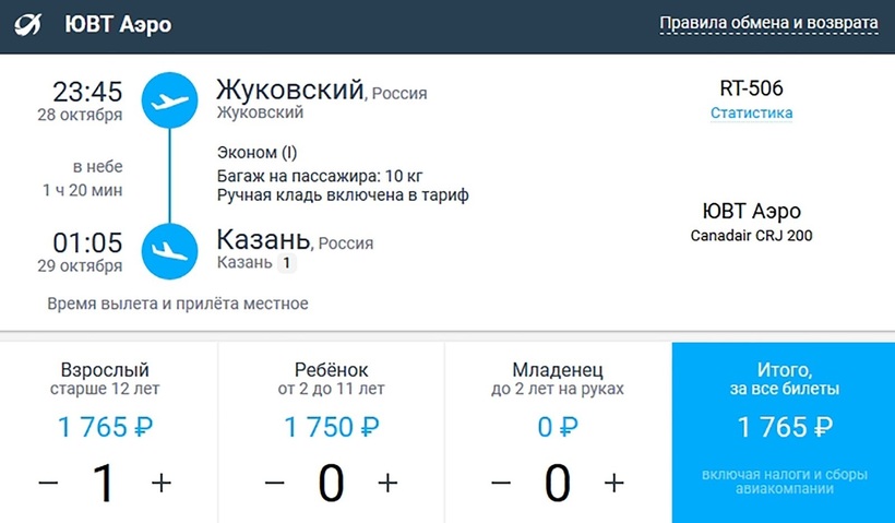 Но UVT Aero (маленькая казанская компания) в неделю совершает только 5 перелетов. И не совсем удобная багажная политика: в стоимость любого билета включен багаж на 10 кг и ручная кладь на 5 кг. Никаких других вариантов (например, только с ручной кладью или, наоборот, с более тяжелым багажом) не предлагается. Вылетают самолеты компании из Жуковского. За 2 недели до вылета можно найти рейс от 1800 ₽. Забронировать полет можно только на 2 ближайших месяца.