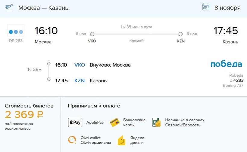 | Победа (DP 6841) Boeing 737-800 | 07:40 Москва (SVO) | 1 ч. 40 мин | 09:20 Казань (KZN) | 16, 18, 21, 23, 25, 26, 27, 28, 29, 30, 31 октября, 1, 2, 3, 4, 5, 6, 7, 8, 9 ноября, … |
