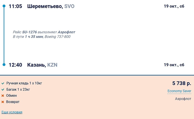 | Аэрофлот (SU 1280) Boeing 737-800 | 23:30 Москва (SVO) | 1 ч. 50 мин | 01:20 Казань (KZN) | 20 октября |