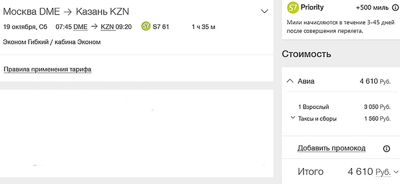 S7 — еще одна крупная авиакомпании России предлагает лететь в Казань с октября по конец марта за 3500 ₽ без багажа или за 4600 ₽ с багажом 23 килограмм и ручной кладью 10 кг.