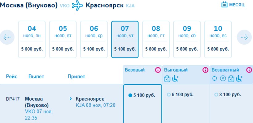 Победа (DP 6547) Boeing 737-800 | 22:30 Москва (SVO) | 4 ч. 40 мин | 07:10 Красноярск (KJA) | 4, 6, 11, 13, 18, 20, 25, 26, 27, 28, 29, 30, 31 октября, 1, 2, 3, 4, 5, 6, 7 ноября, … |