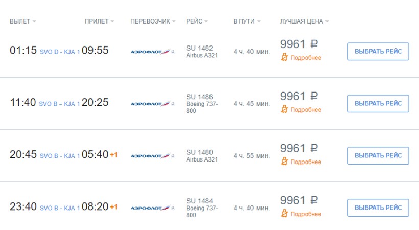 Аэрофлот (SU 1480) | 20:55 Москва (SVO) | 4 ч. 45 мин | 05:40 Красноярск (KJA) | 27, 28, 29, 31 октября, 1, 2, 3, 4, 5, 7, 8 ноября, 31 января, 1, 2, 3, 4, 6, 7, 8, 9 февраля, … |