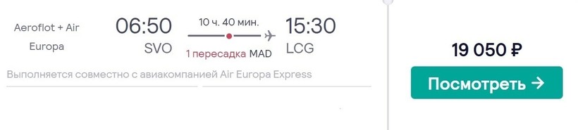Если нет прямых перелетов, то я обычно предпочитаю рейсы с одной стыковкой, потому что так летать получается максимально удобно. Для полета в Ла-Корунью выбрала рейс «Аэрофлота» и Air Europa Express. Да, по стоимости получается немного дороже, чем если лететь с двумя пересадками. Но разница не такая существенная, плюс можно получить скидку, если сразу оформить проездные документы туда-обратно. Также отмечу и вполне удобное расписание у авиаперевозчиков. Отправление утром, на месте окажетесь после обеда. Разница во времени между российским и испанским городами небольшая и составляет 1 час.