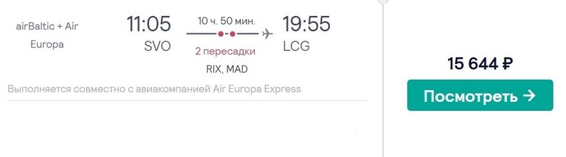 Данный вариант можно рассматривать как более дешевый способ добраться до места назначения. Один из самых оптимальных вариантов по времени в пути и стоимости билетов предлагают авиакомпании airBaltic и Air Europa Express. Дорога до Ла-Коруньи продлится 11 часов. На пересадки в Риге и Мадриде в общей сложности уйдет около 4 часов. Билеты можно приобрести минимум за 15600 рублей (за месяц).