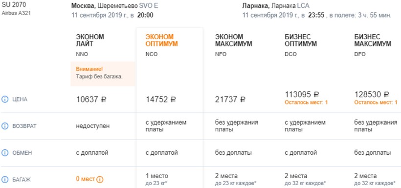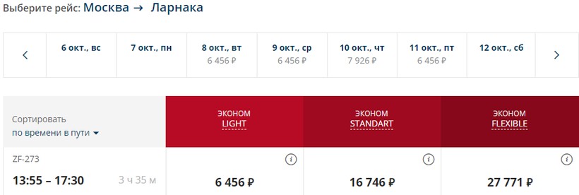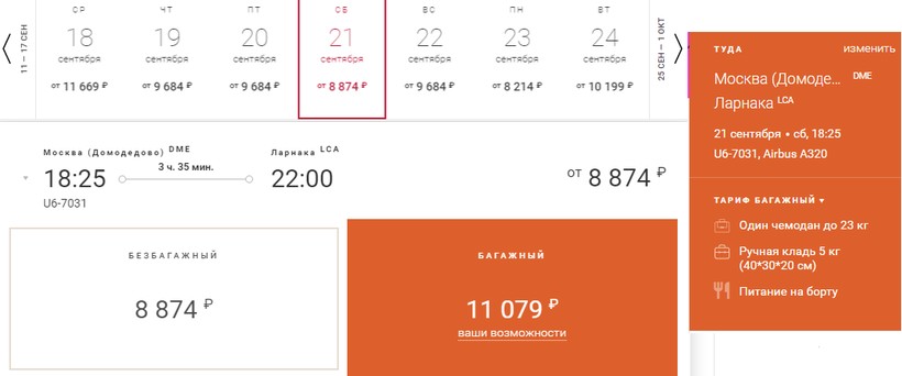 Для полетов в Ларнаку из чартерных перевозчиков я рекомендую Azur Air, потому что авиабилеты у него самые дешевые — стоят в одну сторону от 6500 ₽. Плюс в том, что этот минимальный тариф уже включает багаж до 20 кг.
