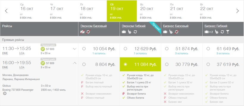 S7 Airlines совершает авиарейсы ежедневно до середины ноября, а с ноября до марта только по понедельникам, пятницам и воскресеньям (на крыльях дочерней компании Globus по код-шеринговому соглашению с Cyprus Airways). И хотя в расписании полетов S7 уступает «Аэрофлоту», я иногда выбираю для путешествия именно этого перевозчика, потому что стоимость авиабилетов у него ниже. На ближайшие даты только туда с багажом они стоят 12500–14500 ₽, но если бронировать за 1 месяц и более до вылета — от 11000 ₽, в обе стороны — от 22000 ₽. Полет в бизнес-классе — от 31000 ₽.