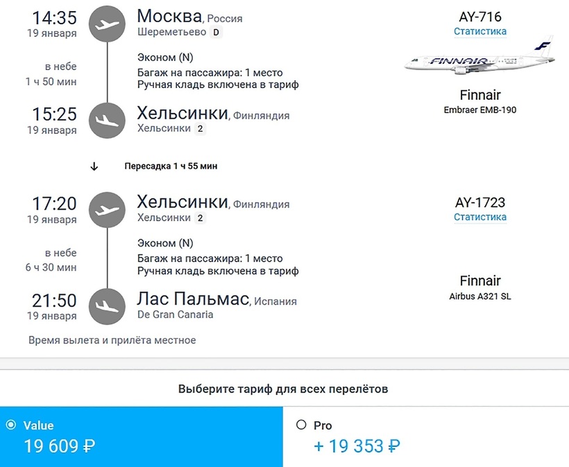 С наступлением высокого сезона (в апреле) перелет выполняется совместно с перевозчиками NORRA и Iberia Express. Теперь стыковок две: в Хельсинки и Мадриде (Барахас). Полет становиться дольше и дороже. Авиапутешествие в разгар туристического сезона (июль — август) обходится в 33000–45000 ₽. А времени займет почти сутки. Стоимость бизнес-класса в низкий сезон начинается с 40000 ₽, а в высокий — с 73000 ₽. Авиапутешествие с Finnair подразумевает неплохие условия для полета зимой и весной (невысокая цена, короткие рейсы), но для лета можно найти более удобный вариант.