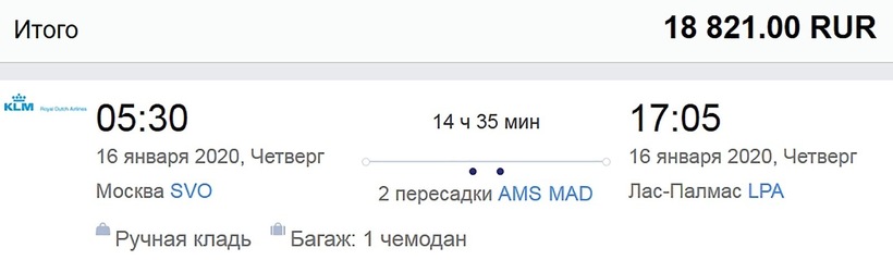 KLM. Авиакомпания предлагает лететь (из Шереметьево) в Лас-Пальмас с двумя стыковками — в Амстердаме (Схипхол) и Мадриде (аэропорт Барахас). Выполняет перелет KLM с испанским перевозчиком Air Europa (от Мадрида до Лас-Пальмас) 4–5 раз в день на протяжении года. Полетное время варьируется от 14 до 20 часов. Самые дешевые перелеты с октября по апрель. Если купить авиабилет за месяц, то полет с багажом будет стоить примерно 19000 ₽.