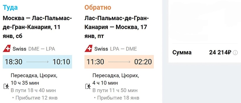 Swiss. Швейцарские перевозчики Swiss и Edelweiss Air летают через Цюрих (аэропорт Клотен). Самолеты вылетают из Шереметьево 2 раза в день. Самый короткий полет длится 10 часов. Как и многие европейские авиакомпании, Swiss намеренно завышает стоимость перелета в один конец. Выгоднее сразу оплачивать дорогу в обратную сторону. Сравните: цена полета в Лас-Пальмас в январе начинается с 30000 ₽, а билеты туда-обратно обойдутся вам в 24000 ₽ (если бронировать за месяц до вылета).